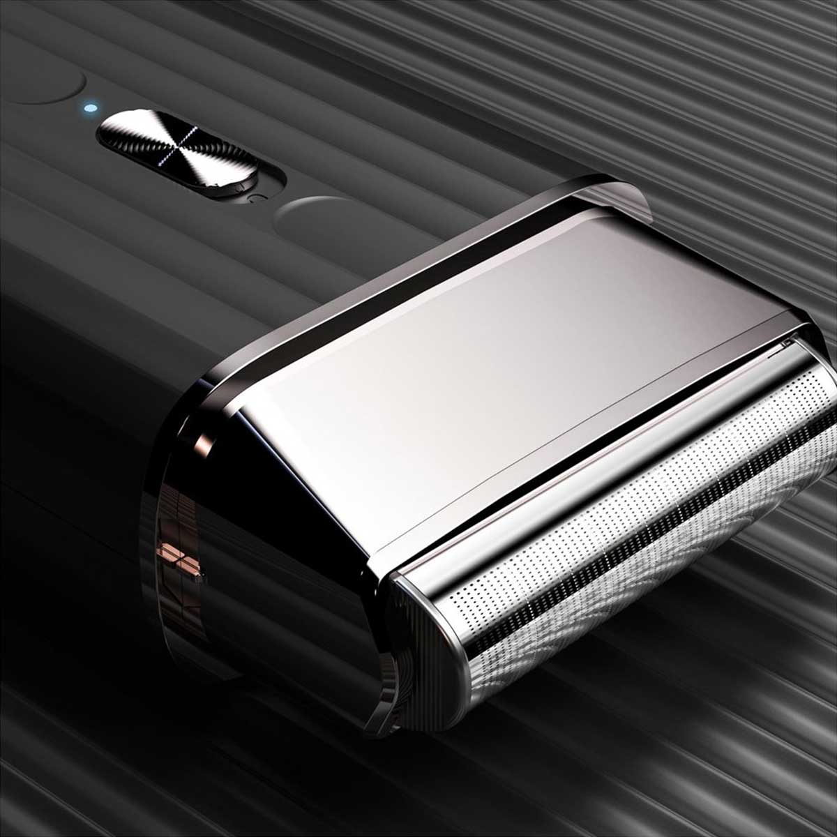 rasoio elettrico professionale con tecnologia di levitazione magnetica, lamina ultrasottile, motore 8000 RPM, 3 ore di autonomia, ricarica rapida.